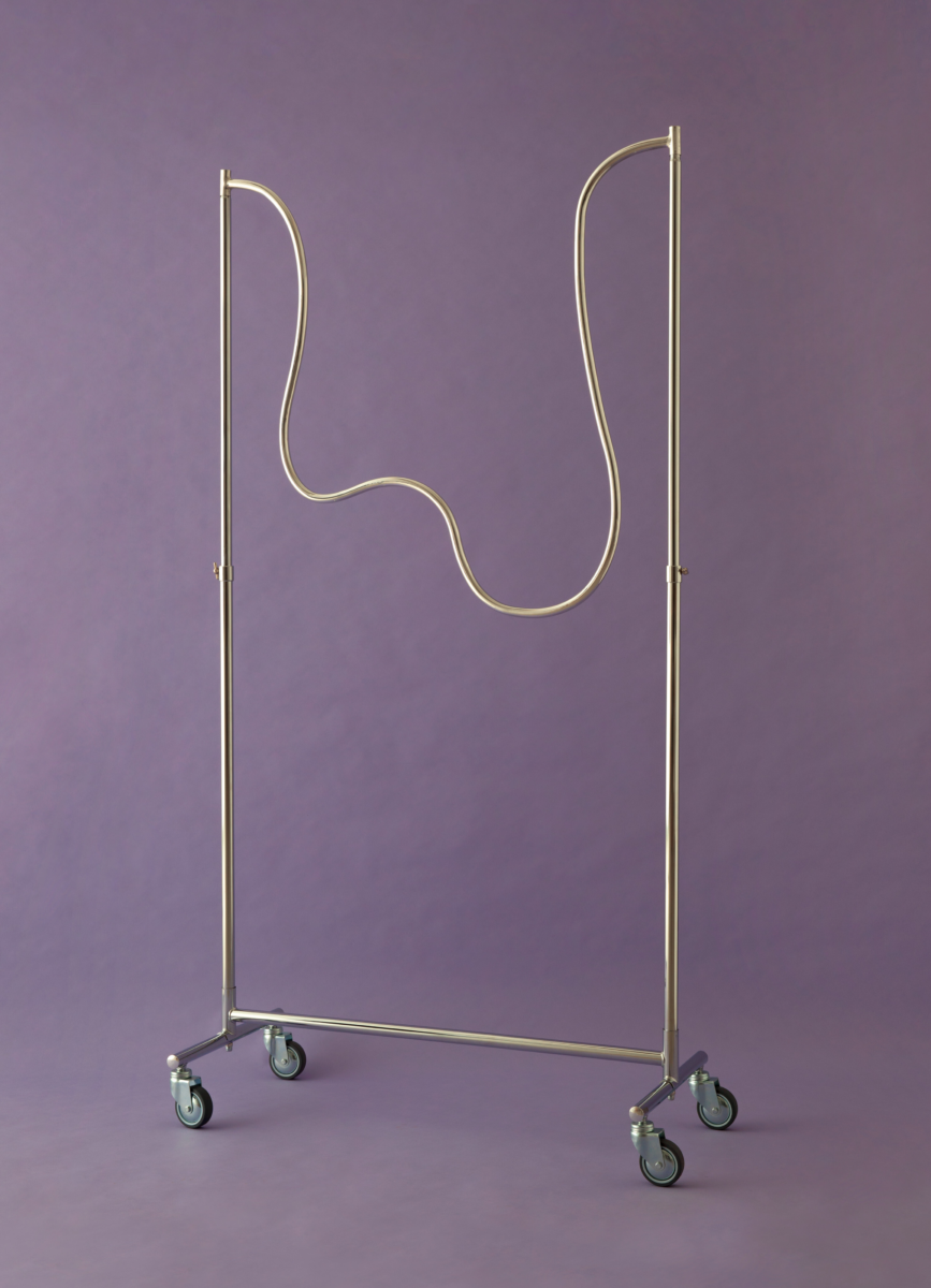 Frauenhände mit rosa Kunstnägeln, verziert mit Logos von Luxusmarken, streicheln ausrangierte Kleidungsstücke. Sie erkunden haptisch jedes Detail des Textils, liebkosen es regelrecht. Daneben tritt ein funktionslos gewordener, weil verbogener metallener Kleiderständer in Erscheinung.